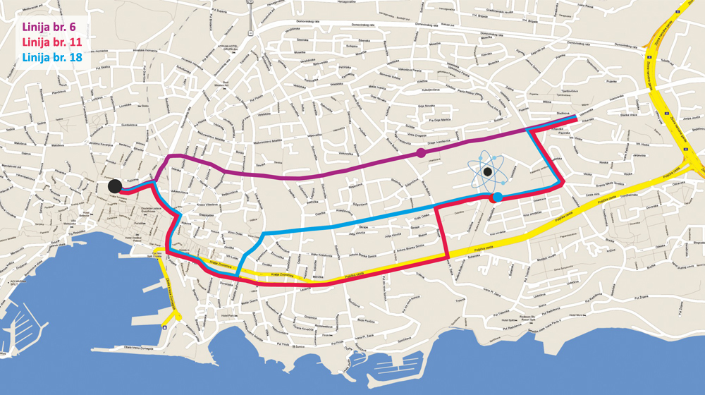 Karta grada s označenim autobusnim linijama br. 6, 11 i 18, u obliku pogodnom za ispis, dostupna je ovdje. "Atom" označava položaj Sveučilišne knjižnice. Žuta linija označava najkraću rutu od autobusnog i željezničkog kolodvora u gradskoj luci do kampusa.
